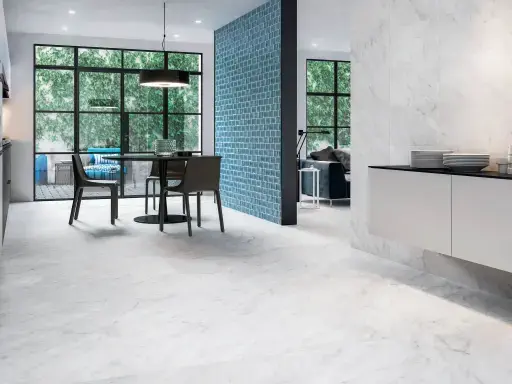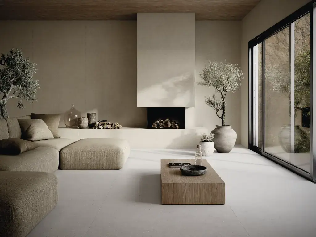 Grote vloertegels geven een ruimtelijk effect en zorgen voor een moderne, luxe uitstraling. Perfect voor open ruimtes.